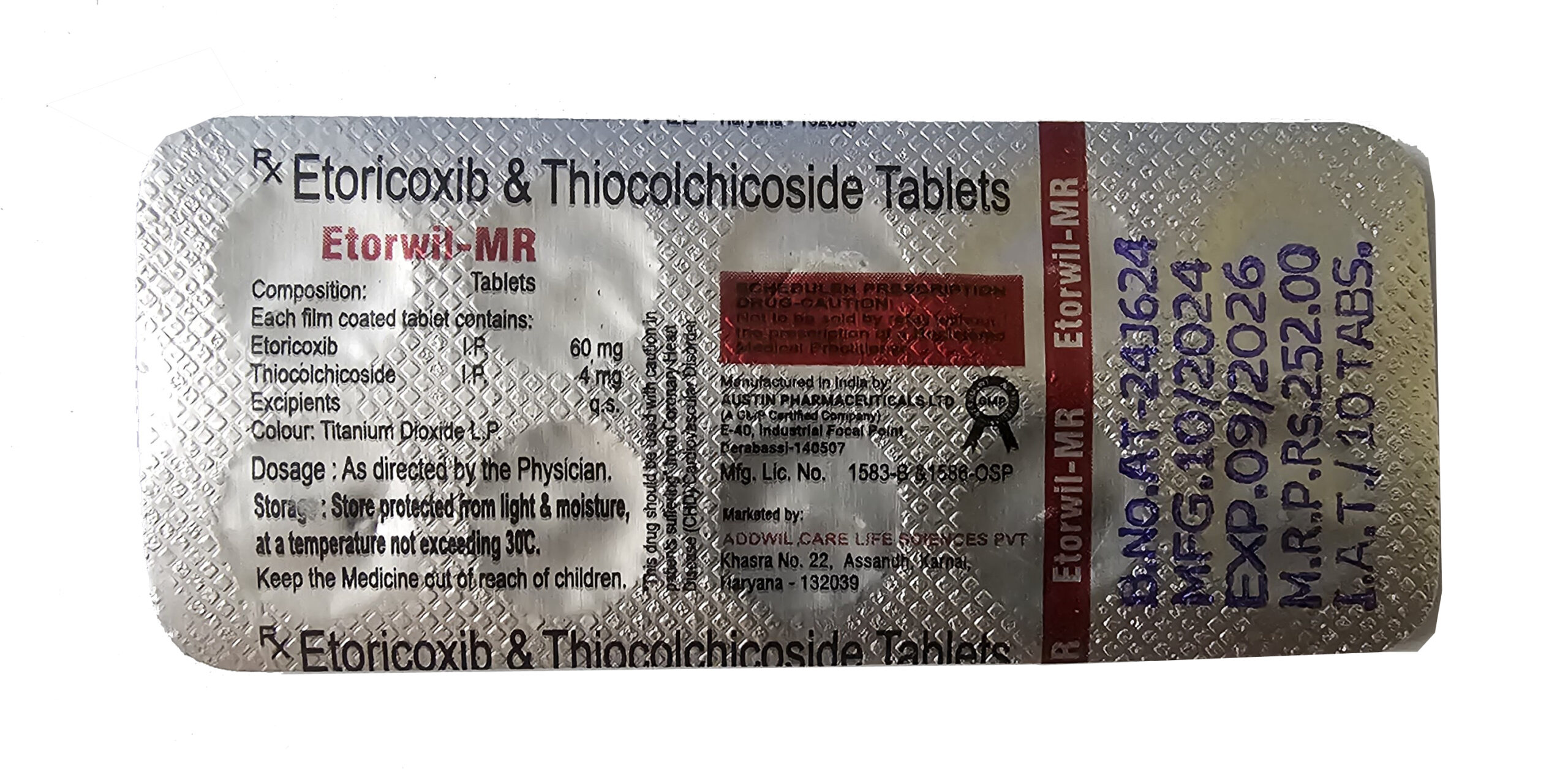 Etoricoxib + Thiocolchicoside is a combination of two medicines: Etoricoxib and Thiocolchicoside, which relieves pain and relaxes the muscles. Etoricoxib is a non-steroidal anti-inflammatory drug (NSAID) which works by blocking the release of certain chemical messengers that cause pain and inflammation (redness and swelling). Thiocolchicoside is a muscle relaxant. It works on the centers in the brain and spinal cord to relieve muscle stiffness or spasm and to improve pain and movement of muscles.