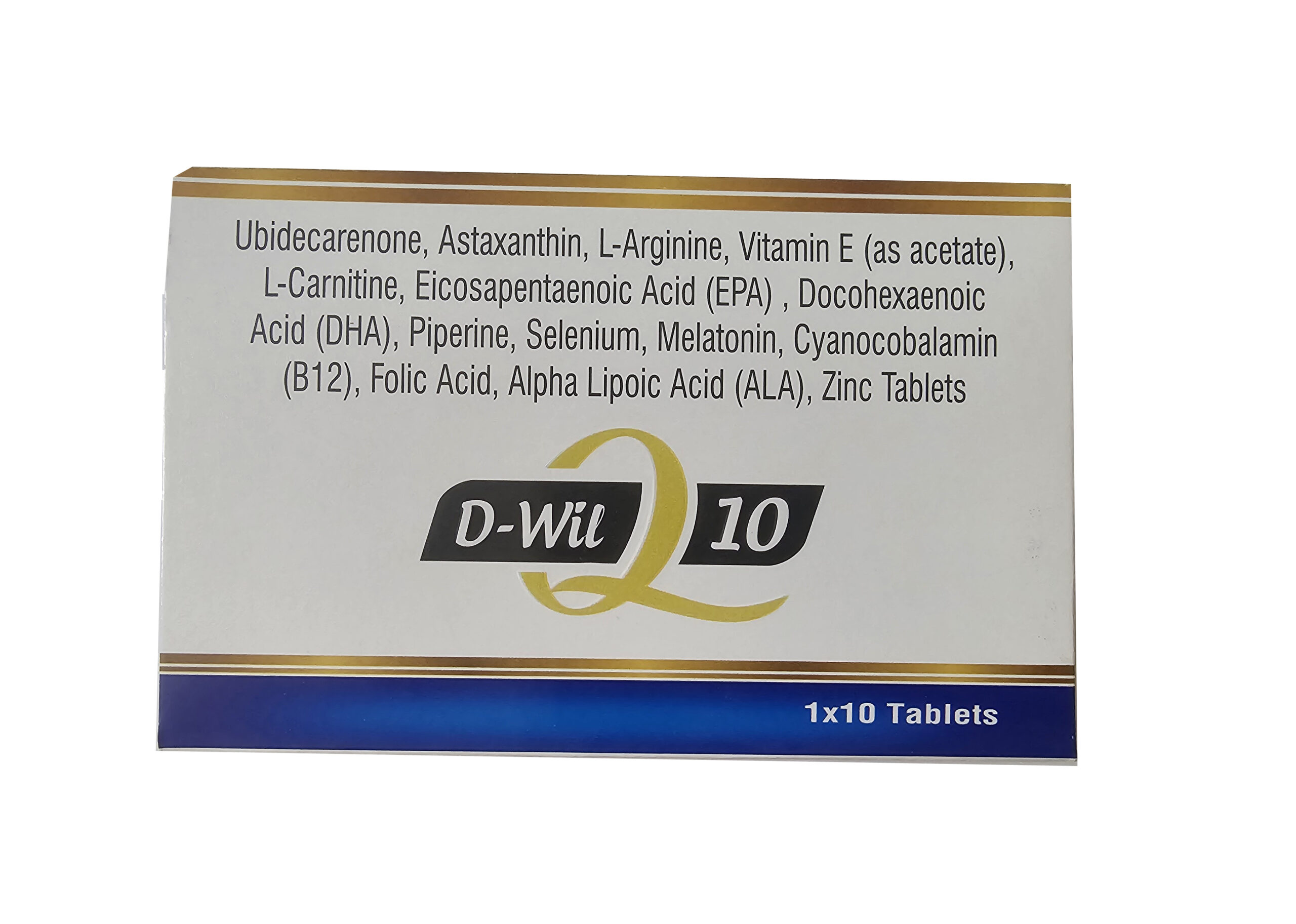 Ubidecarenone Astaxanthin L-Arginine Vitamin E, L-Carnitine Eicosapentaenoic Docohexaenoic Acid Piperine Selenium Melatonin Cyanocobalmin Folic Acid Alpha Lipoic Acid Zinc tablets.